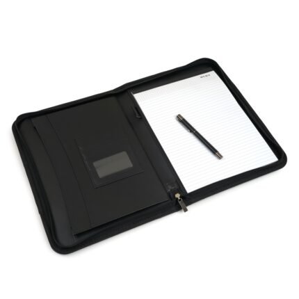 Personalized gift leather cover file, metal zip Lock Closure, Note Pad/Memo Book & Clip Holder, pen holder, pockets for bank card & documents inside cover, and official nice looking carry handle, Customizable with name and logo. Perfect for any occasion. Corporate gift for office employess, boss and clients, Customizable with name and logo.